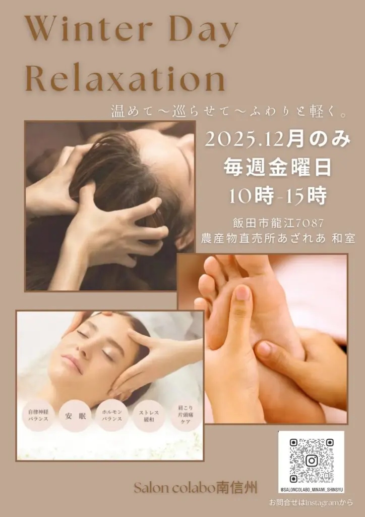冬の冷えや疲れを感じやすい季節に、心と体をふんわりとほぐす癒しの時間はいかがですか? 12月の毎週金曜日、あざれあ和室にて「Winter Day Relaxation」を開催します。 温めて、巡らせて、ふわりと軽く。 肩こり・首こり・自律神経の乱れなど、 寒さで滞... -